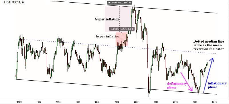 The copper/gold ratio chart shown above, apart from the fact that it moves in a slightly tilted downtrend channel, it mimics very closely the price of BDI. Even as prices spent most of their time in the lower half of the channel, an upside move indicates an inflationary phase while a downside move points to deflationary forces at play. The median line serves as a fence for super economic growth. There is a small period of hyperinflation which matches the BDI chart, and the last short vertical move of super inflation which meant the super economic growth cannot sustain for long time.