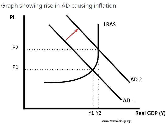 When a healthy economic growth induces a higher inflation (Chart 1) the aggregate demand (AD) in an economy expands faster than long run aggregate supply (LRAS), a higher inflation rate will be expected. With demand rising faster than supply this suggests that economic growth is higher than the long run sustainable rate of growth.