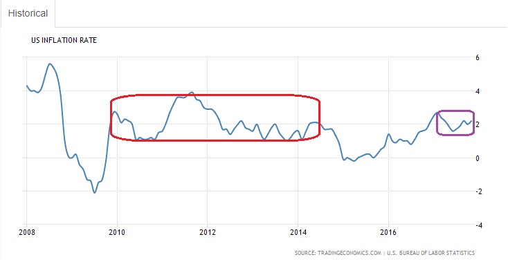 Has the number of rate hikes carried out so far by the US Federal Reverse (FED) provided sufficient evidence to conclude what the situation for inflation is? Since the global financial crisis struck in 2008 Fed interest rates (detailed in Fed Funds Rate) have been kept at 0.25% from Dec 2008 for a good 7 years before raising it to 0.5% in Dec 2015 to spur economic growth.