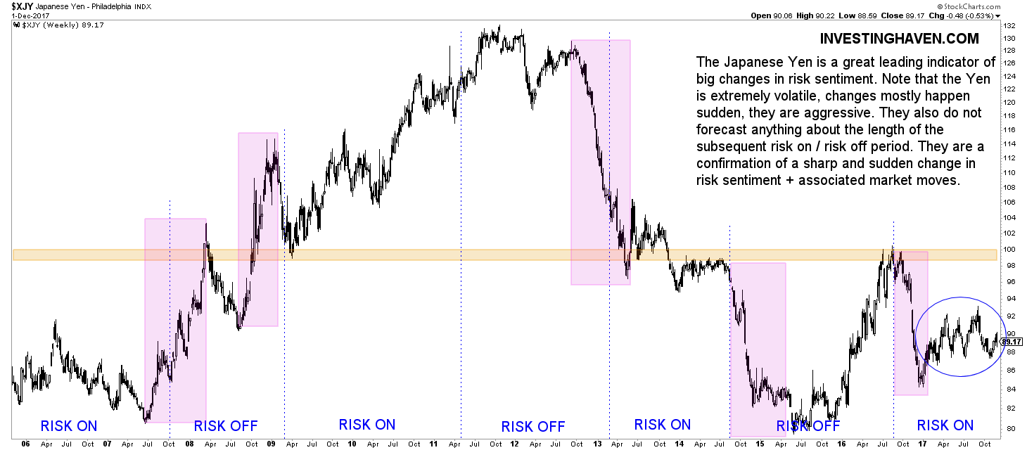 What is the outlook for global markets? That is the million dollar question of course. InvestingHaven’s methodology says that there are a couple of leading indicators, one of them being the Japanese Yen, one of the classic safe havens (read more in our safe haven forecast for 2018: watch the correlation between gold and the Yen ). The trick is to understand what each indicator stands for; in other words what can you read and what can’t you read in an indicator. Let’s deep-dive into what the Japanese Yen, one of our risk indicators, spells for global markets in 2018.