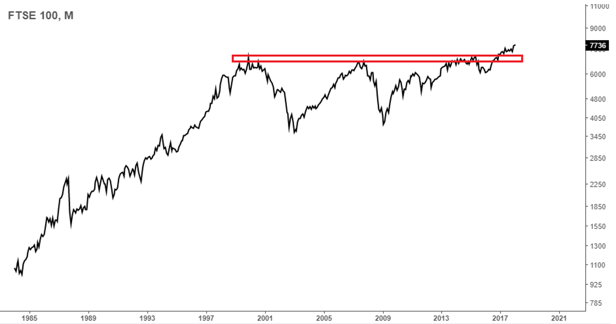 What does this mean for the U.K. stock market? We believe this has positive implications moving ahead, and we can derive this from the FTSE 100 chart which reveals a macro view.