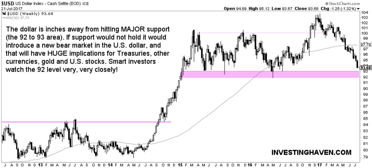 As the Euro / Dollar is the most important currency pair, it should not come as a surprise that the dollar is inches away from hitting major support (the opposite of the Euro). As seen on below chart the Dollar has a very strong support area at 92 to 93 points, just one percent below today’s price level.