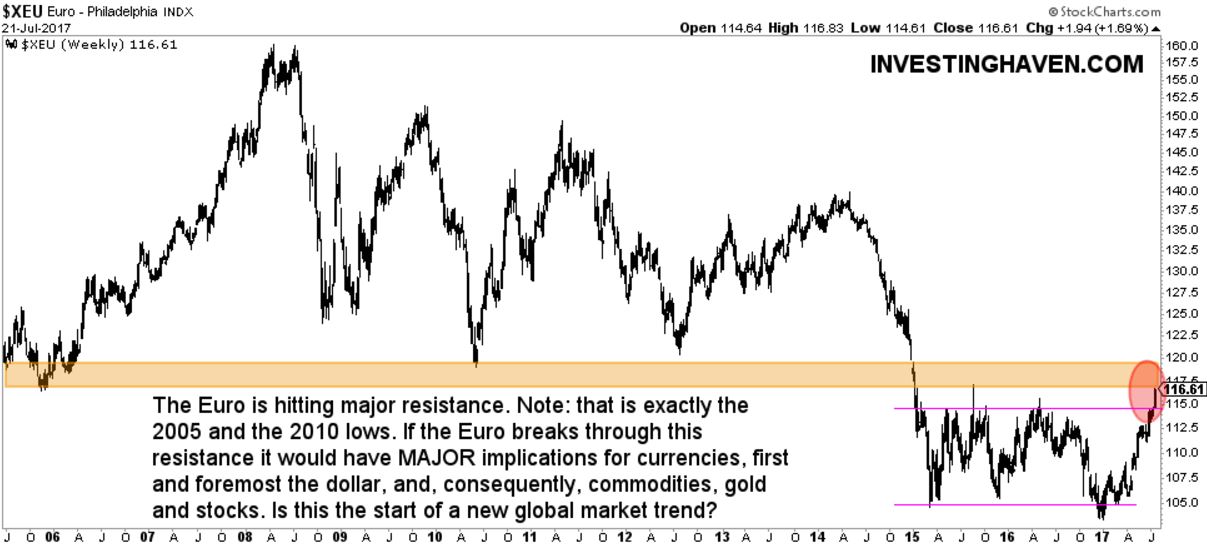 The two charts, right now, that are hitting major support and major resistance: the Euro and the U.S. dollar.