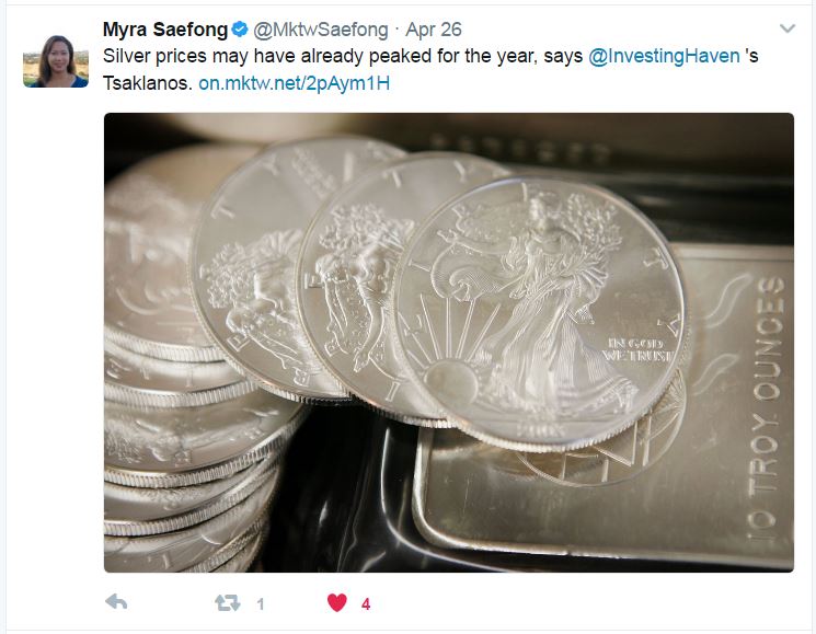 “With just two trading days left in April, silver looks as if it peaked for the month at $18.514 an ounce on April 17.”