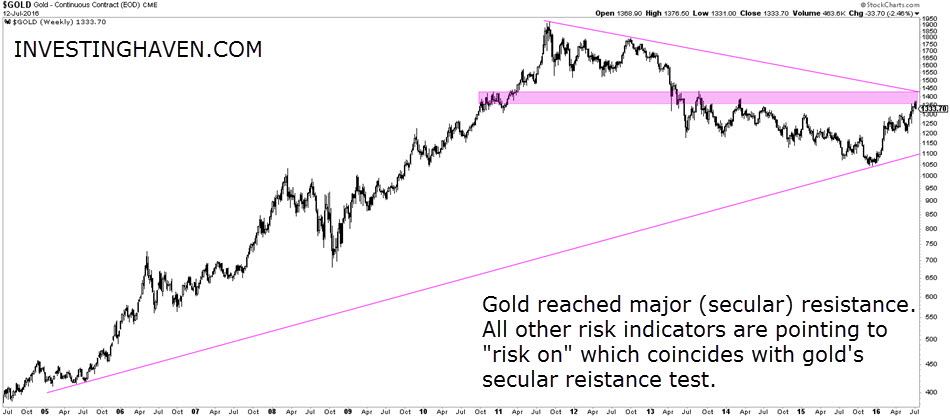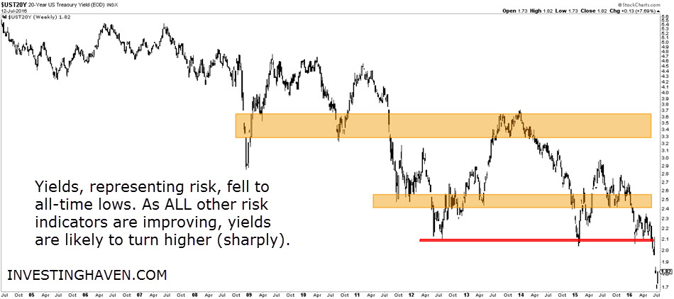 Third, gold, the ultimate safe haven, has rallied sharply in 2016 similarly to the Yen. It was an impressive comeback of the yellow metal. However, as the secular gold chart shows, the metal arrived at double secular resistance (1) the trendline which connects the 2011 and 2012 peaks (2) as well as the peaks after the 2013 collapse. It is not likely, given the setup of the other risk indicators, that gold will simply break through this in 2016 (probably also not in the first part of 2017).