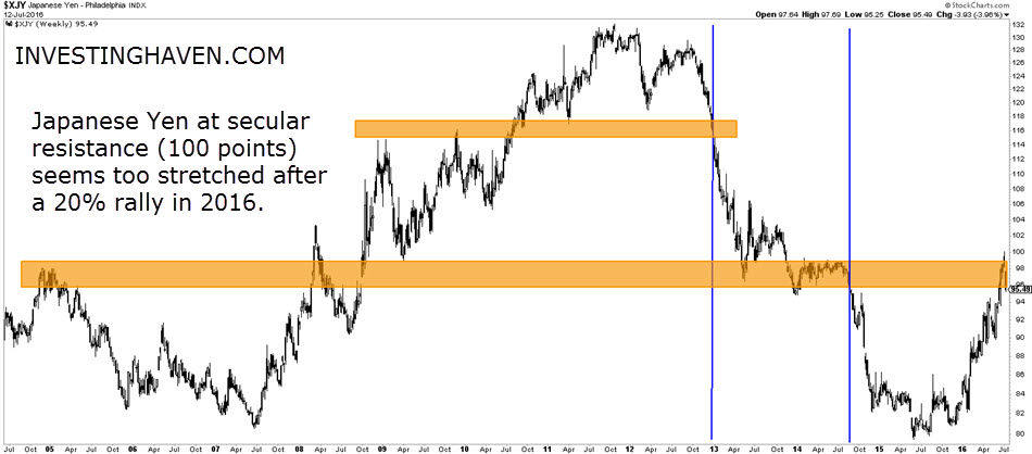 First, the Yen at 100 points has an important meaning. The Yen chart shows how this safe haven currency has arrived at secular resistance. True, the rally in 2016 has been impressive, and it probably has more legs at a certain point in the future, but for now, the rally has most likely run its course. The Yen at 100 points is, as shown on the chart, resistance area. A retracement from here is the most obvious path.