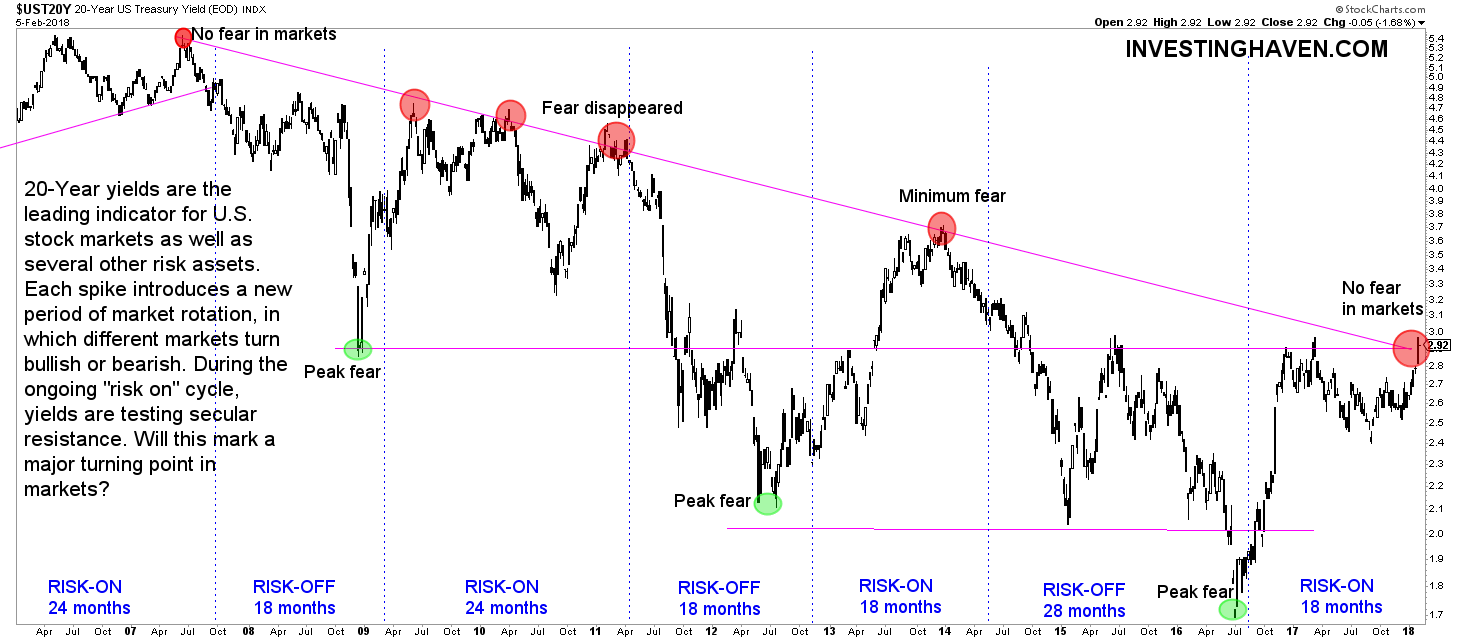 We are talking about yields. In particular, U.S. 20 year yields are the leading indicator for U.S. stock markets. We identified 3% in 20 year Yields as a major point. The chart below shows that this level got achieved this week.