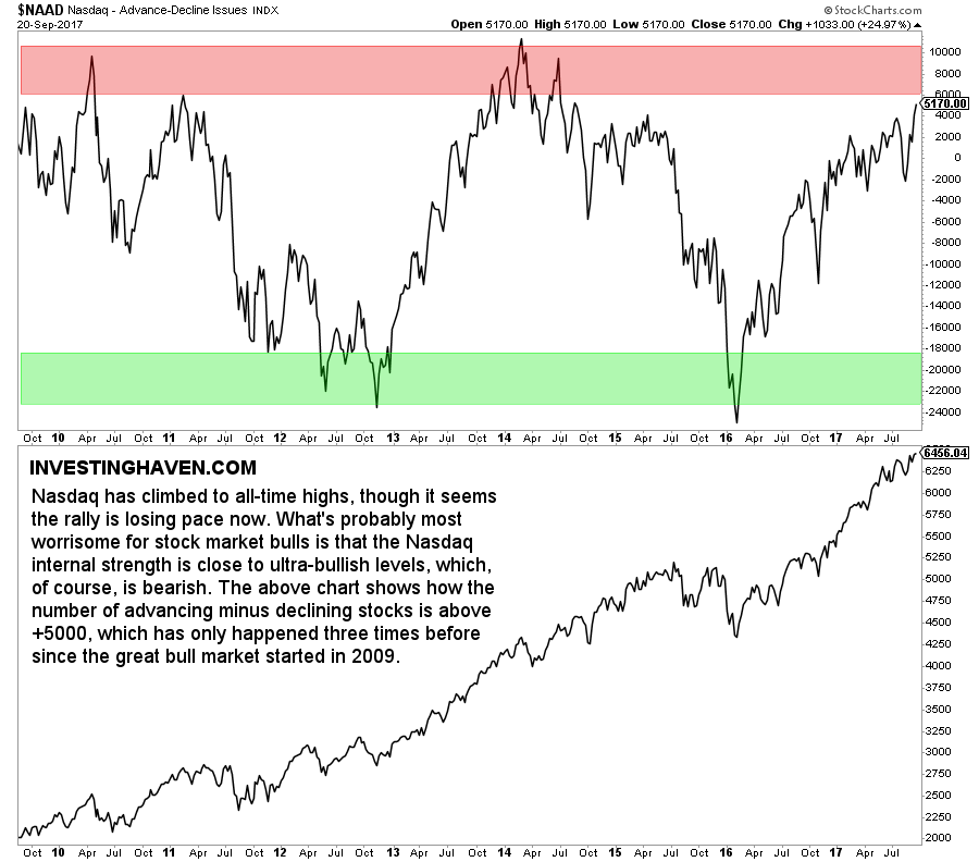 One of our favorite market internals is the number of stocks advancing minus the ones declining. That indicator is now about to enter an ultra-bullish area. As we all know: ultra-bullish equals bearish.
