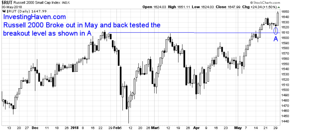 When we zoom in to look at the performance of Russell 2000, we see that this is a triple top breakout. We also note how there is already a successful back test that just took place (annotated in the chart below, A). At this point, the path of the least resistance seems to be higher and that confirms our Bullish stance on the US Stock market.