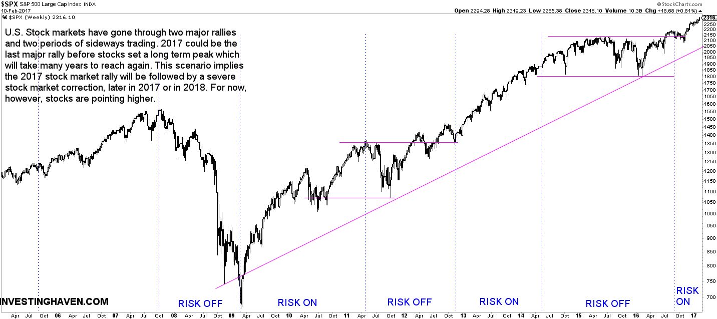 All in all InvestingHaven analysts believe that a stock market correction could occur short to medium term which would bring the S&P 500 to the 2200 level. Longer term, they believe that, once a long standing target of 2500 points is reached, a stronger correction could take place, which could break the risk on cycle, depending on how other leading markets behave. Forecasting the timing for these events is simply impossible.