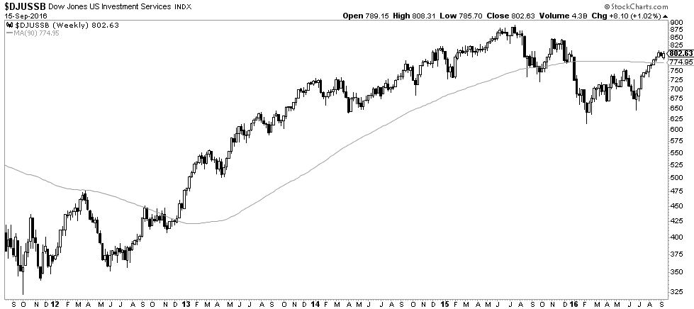 The second chart shows the invesment services sector, represented by DJUSSB, and the chart pattern is very similar to the one above, so we present it without additional comment.