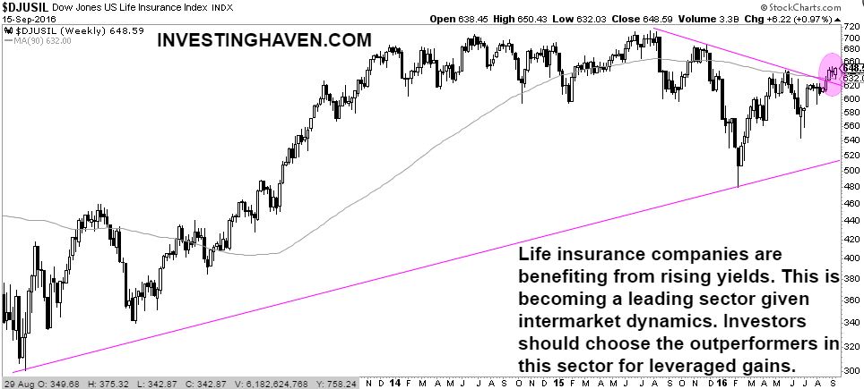 Which sector(s) that are benefiting from the new primary trend? Life insurance companies are outperformers even if stocks are retracing, just like investment services. The first chart makes our point clear; it shows the life insurance sector represented by DJUSIL.