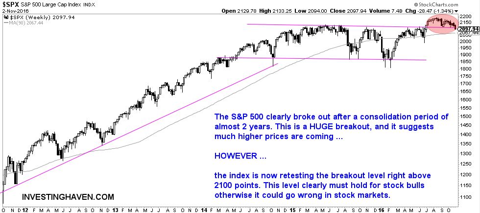The key question in such type of environment is at which point things are really becoming a concern. The answer to that question is, as always, primarily visible on the charts. As the belwether of stock markets, we look at the weekly S&P 500 index below.