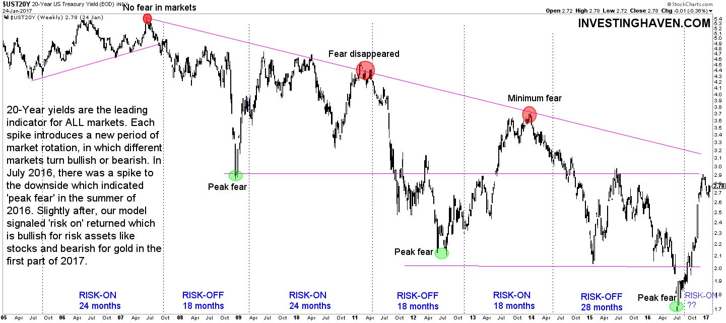 ‘Risk on’ is determined based on the 10-year Treasury Yield as the most outspoken risk indicator. As shown on the chart, every time an important cycle top or peak is reached, it signals a change in risk sentiment.