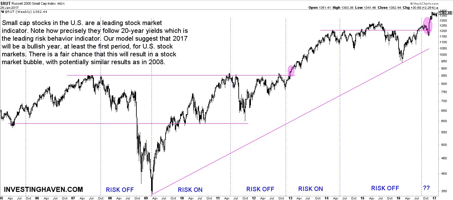 Stock markets clearly follow the ‘risk on’ and ‘risk off’ pattern. The crucial unknown is the time of how long such a cycle lasts, very hard to know for sure, which is why the position and signal of all leading markets should be considered. For instance, the chart pattern of bonds, stocks, gold and important currencies all together should be taken into account, according to InvestingHaven’s research team.