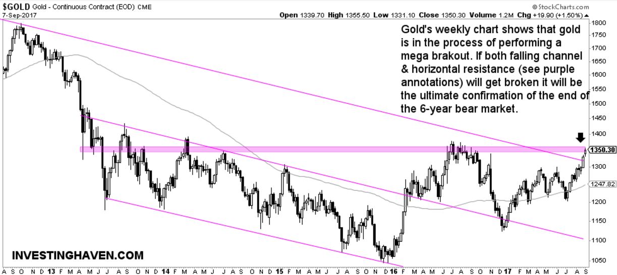 Below chart makes the point, and is representative for Treasuries and Yen (they all have similar chart setups). If gold manages to break above the $1350 to $1370 area it will be a mega breakout. It will confirm a new market trend, with new intermarket dynamics. Safe havens will outperform U.S. stocks. The safest place for stocks will be emerging markets, and, potentially, some European stock markets.