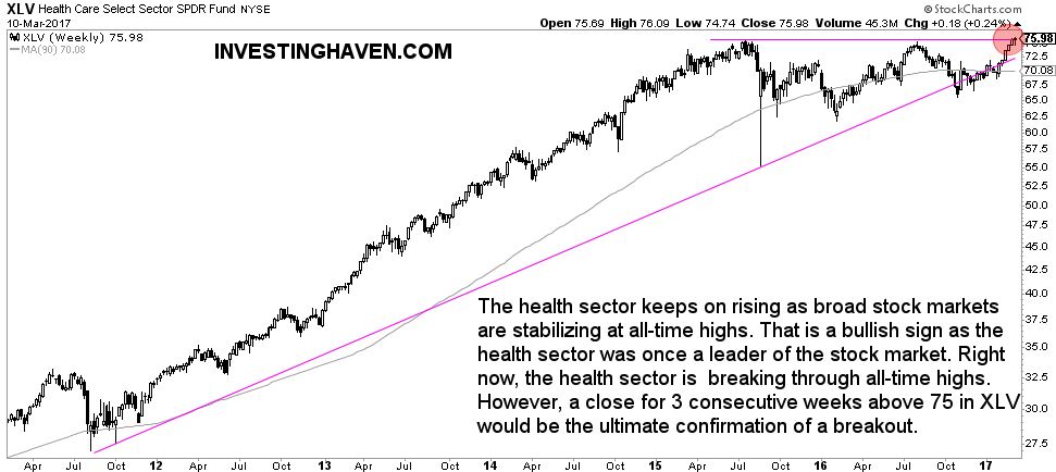 In the U.S. there is a potentially very important event taking place: health care stocks could be breaking out. The health care sector, represented by the XLV ETF, touched all-time highs right at a triple top level. This is major news more so because nobody in the financial media talks about it. The * really * important events in financial markets remain ‘hidden’ for 90% of investors. InvestingHaven’s research team, however, keeps on reporting on these important events.