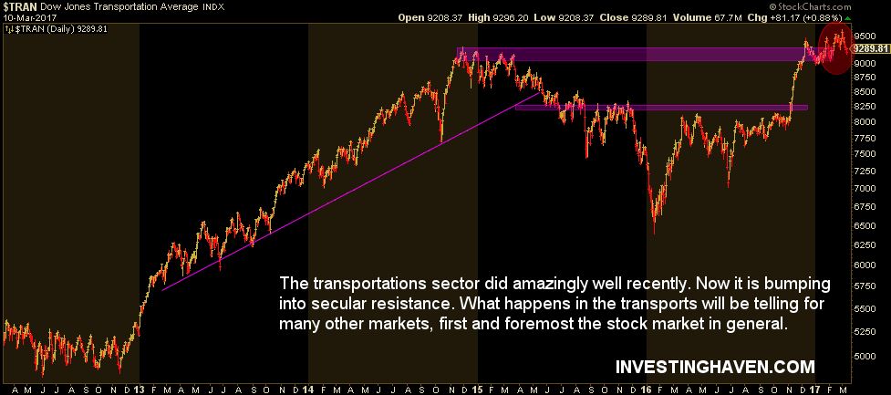 The transportation index will be the ultimate leading indicator which stock market investors are watching. It is now trading at major support. If support holds, the stock bull market will continue. However, if support gives away, you should watch the bear(s) closely.