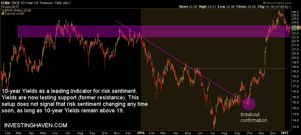 At this point in time, InvestingHaven’s research team does not see a stock market correction looming in the near term. Their call is based on their leading market indicator, the 10-year Yield. As seen on the first chart, there is no reason to be concerned from a technical perspective. As long as there is no breakdown in play, the overarching ‘risk on’ sentiment remains intact. The important levels in the 10-year Yield to watch are 22.50 and 19.
