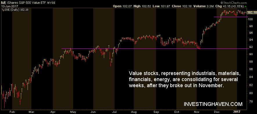 In reality, the stock market is currently going through a market rotation, in the short to medium term timeframe. Value stocks, representing industrials, materials, financials and energy, are now consolidating after they enjoyed a strong rally in the fall of last year.