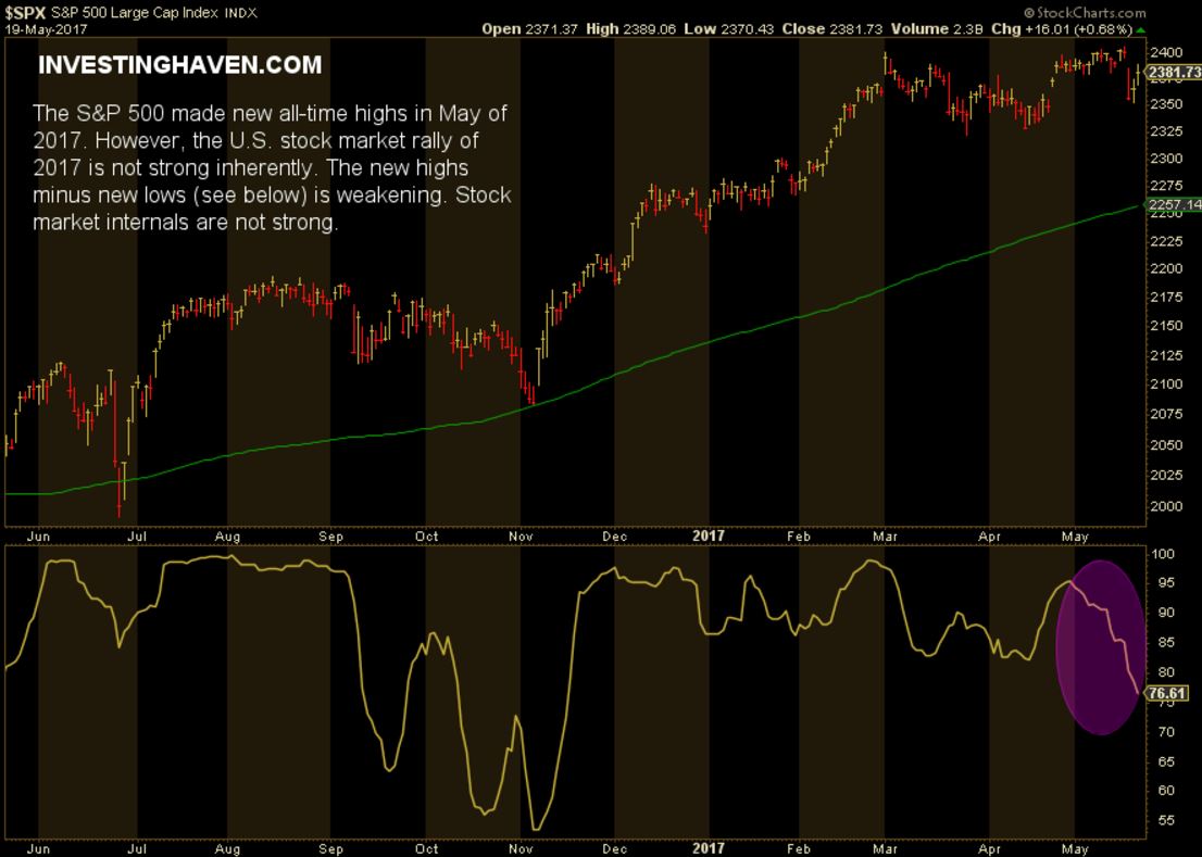 The stock market rally of 2017 is rather weak, says InvestingHaven’s research team. That is because stock market internals are weakening on the rally, and that is fundamentally not good.