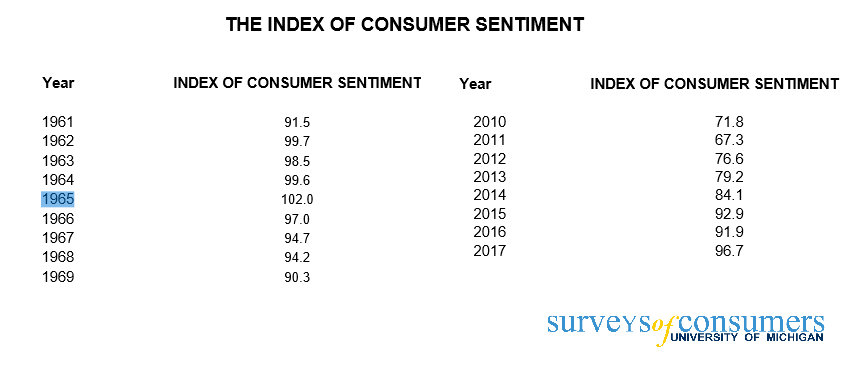 The 60’s were known for a strong sentiment of Distrust in the US government. Yet the stock market continued on an uptrend for most of the decade because of renewed trust in the American Economy. A similar sentiment is observed in the US stock market in 2017. According to the University of Michigan’s Surveys of Consumers chief economist, Richard Curtin: