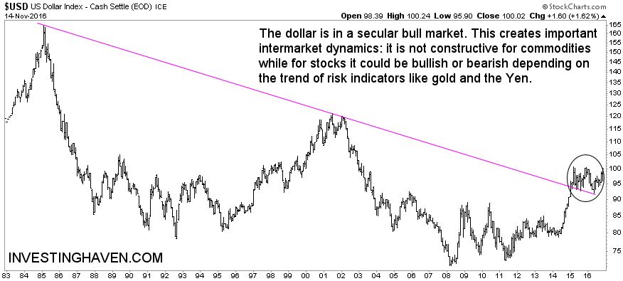By far the most important trendline in the dollar’s bull market is visible on the first chart, a 33-year chart. In December of 2014, the dollar broke out of its bear market. Note that the descending trendline is represented by the long term which connects the peaks of 1985 and 2001. Since then, the US dollar got in a clear bull market, marked with the circle on the chart.