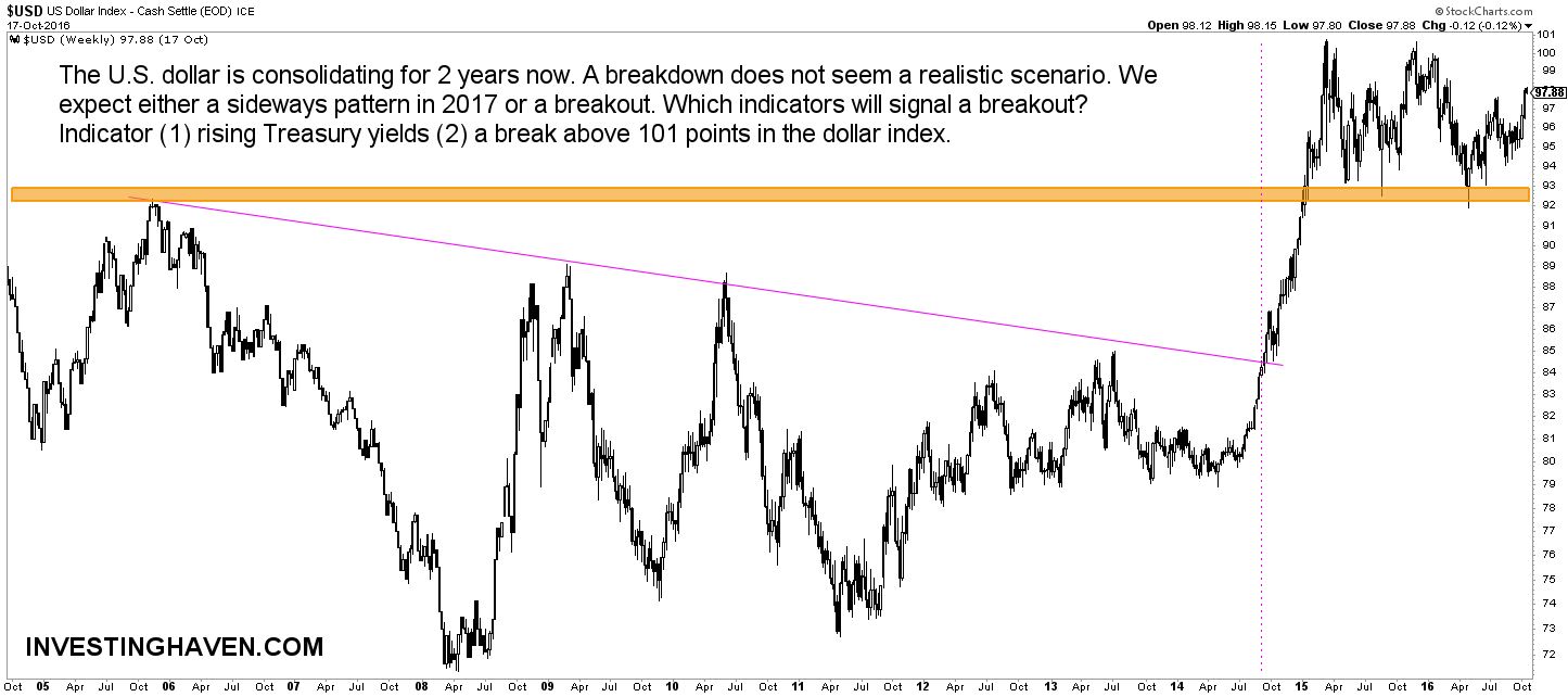 The other possibility is that the U.S. dollar will trend higher in 2017. Which indicator are we monitoring which spells a trend higher? It is strength in Treasury yields combined with a break above 101 points in the U.S. dollar index. In other words, intermarket dynamics could push the dollar higher driven by rising yields, and that really is the primary market trend which we forecast in 2017.