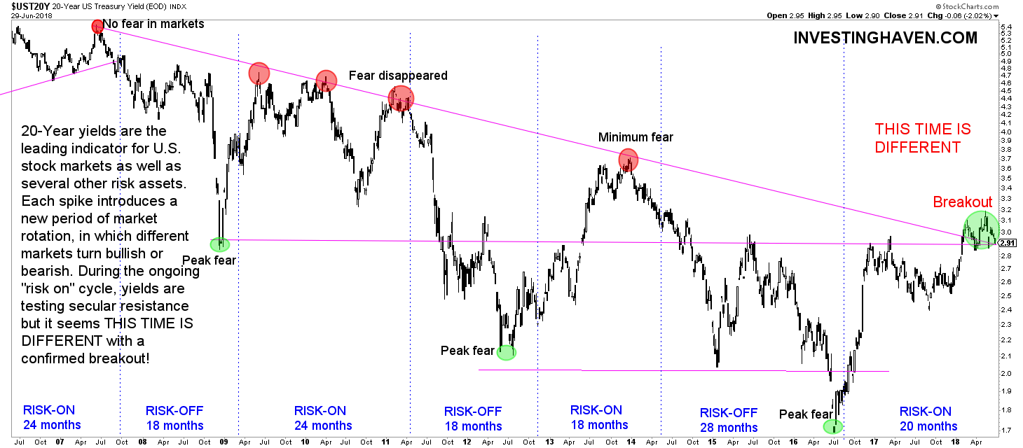 With the strong correlations between the US Dollar vs emerging markets and commodities, it becomes clear that the most important market we are looking at is 20-year Treasury Yields (in the U.S.). Yes, this is, by far, the most important market in the world with the most important influences on a global scale. Bare with us as Yields are about to reveal future direction of the Dollar, emerging markets, US stocks, commodities, and precious metals any time soon!