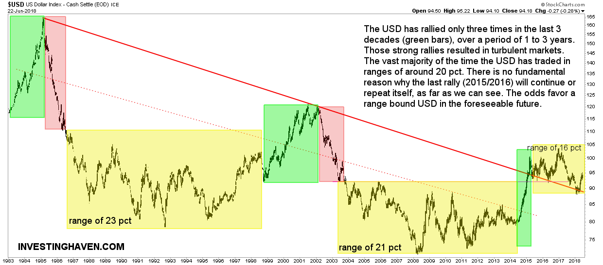 On the other hand, though, looking at the long term Dollar chart, it is clear that most often the Dollar tends to be range bound. History has shown that the vast majority of time the Dollar trades in a range of approx. 20 pct (yellow boxes). Only very exceptionally there is a strong rise (green areas) sometimes followed by sharp declines (red areas).