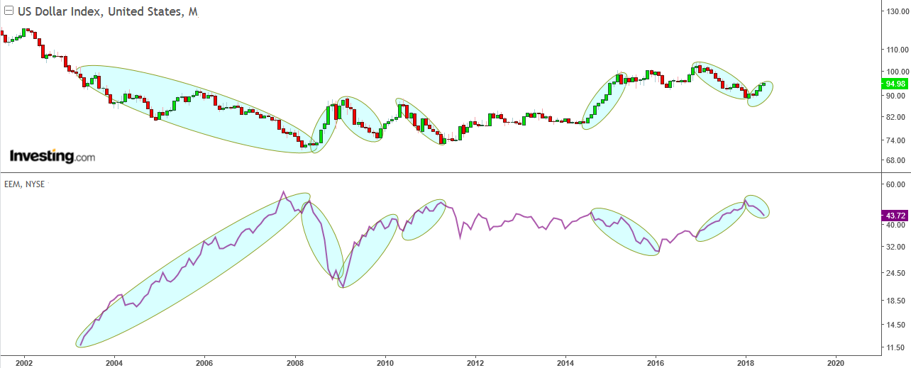 As the first chart shows emerging markets (lower pane) have done well when the Dollar was falling (upper pane), those periods indicated with a light blue oval are the ones to focus on. This chart goes back 15 years in time.