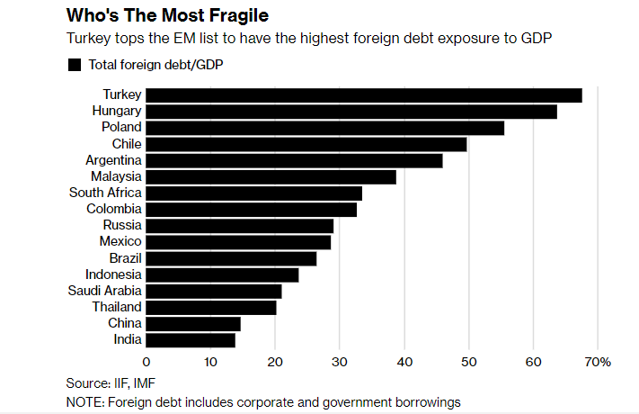 We provided our select top emerging markets to invest in back in 2017 and still consider them our top selection. They also happen to be the least “fragile” to US Strength as they have the lowest foreign debt exposure to GDP as show by the chart below, with the exception of Chile, which we’ve mentioned in the article above has a unique setup.