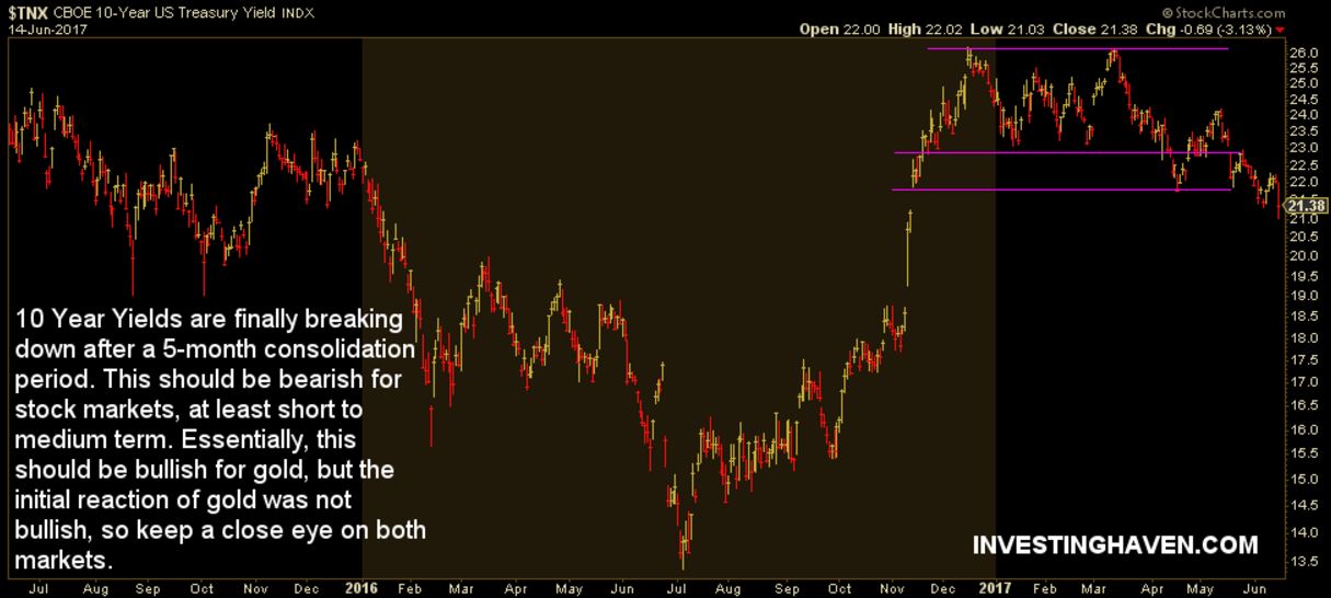 The initial reaction of Yields, as seen on the chart, was a strong retracement. That is odd because the reaction of bonds was muted, gold came down as well, and stocks slightly. These markets simply cannot move in the same direction, most of them are negatively correlated markets.