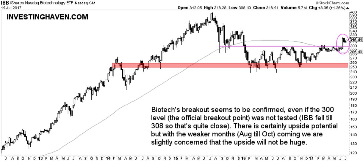 The biotech space is also bullish right now. Prices should move higher, but we are concerned about the fact that the seasonally weaker months are coming. Otherwise, for the short term, biotech looks great.