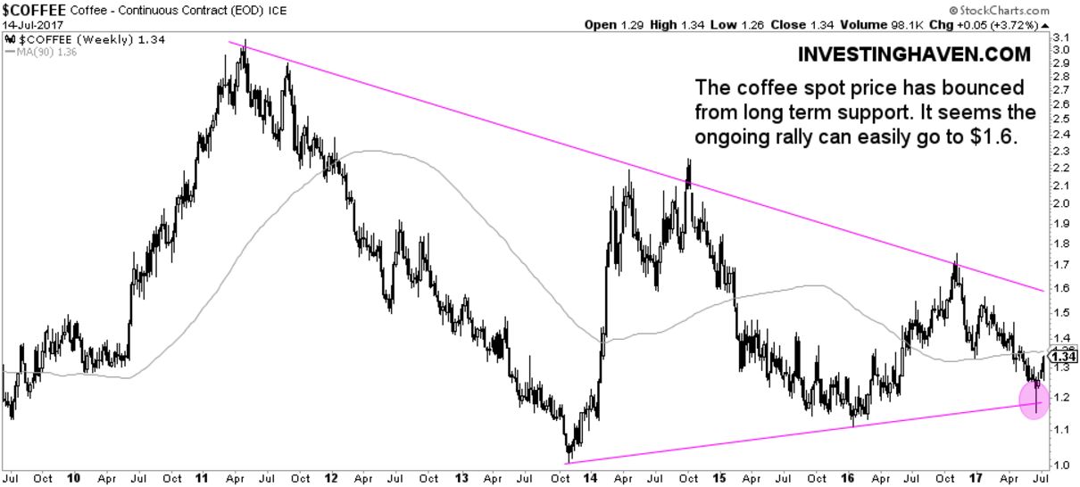 Coffee has a beautiful setup. We noticed the coffee price crash of 2017, and said that coffee was at a make-or-break level. Visibly, support held, and we see coffee moving higher from here. The upside potential is some 30 percent. The way to play it is through JO ETF.