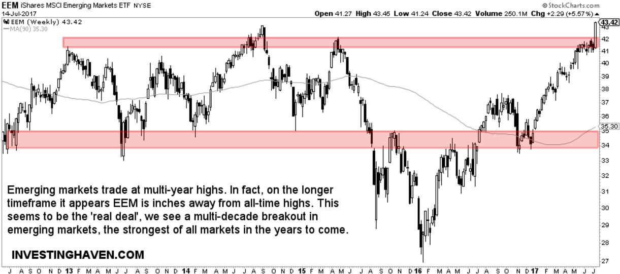 We started writing about emerging markets more than a year ago, and we identified an emerging markets forecast for 2017 in which we identified 42 points in the EEM ETF as the most important price point to watch. Well, we have news: this week, EEM ETF broke above 42 points. This is MAJOR news and InvestingHaven readers were lucky enough to follow all this long time in advance. Even now, as this major event took place, major financial sites are not spotting this incredible buying opportunity, as seen in tese emerging markets articles on Bloomberg and CBS News.