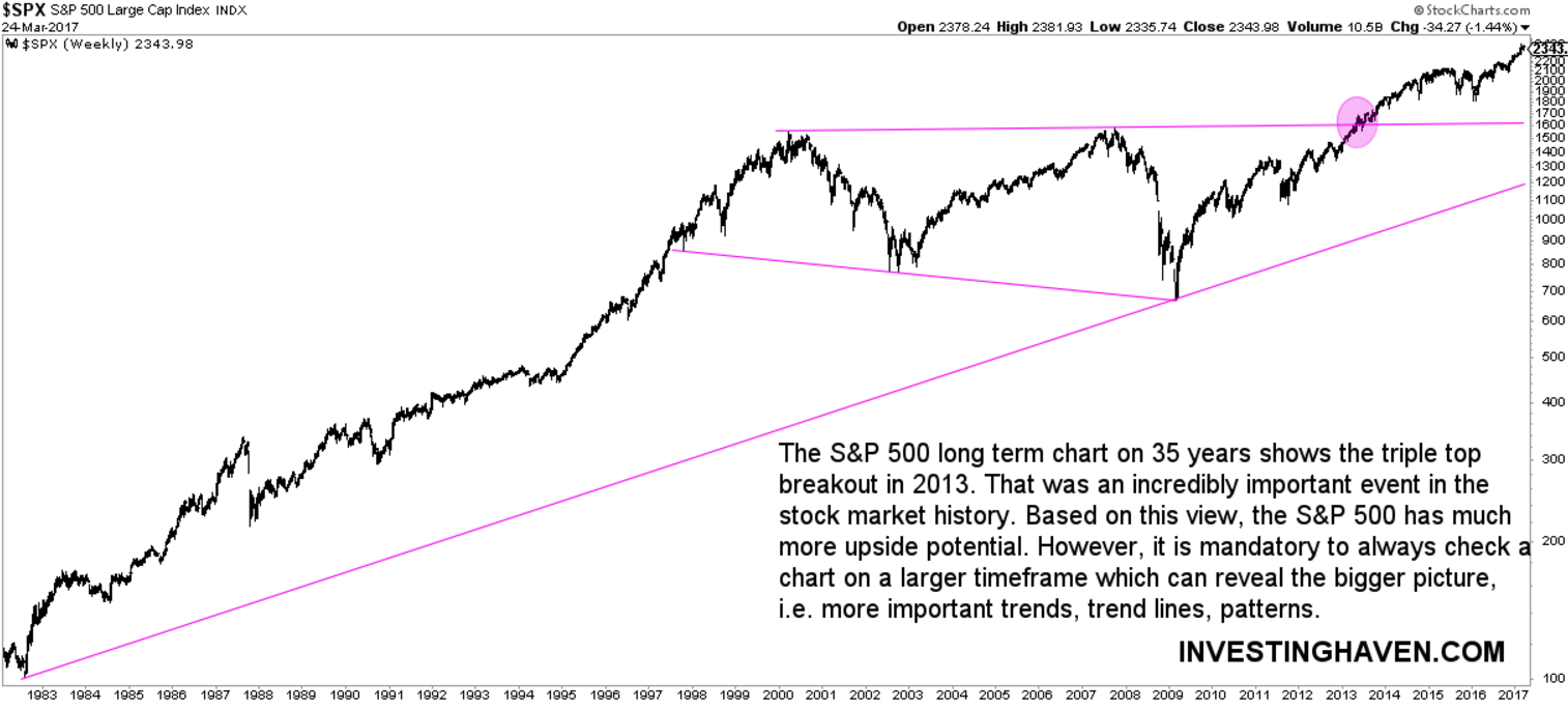 First, the 35-year chart of the S&P 500 reveals a hugely bullish chart formation. Most believe that the US stock market entered a bear market in 2000. That is partly true though. The long term stock market chart shows a double top combined with lower lows. However, after the 2009 lows, stocks moved higher, and set a triple top. That was followed by a breakout, and as it took 13 years to break out we can say it was a ‘secular breakout’.