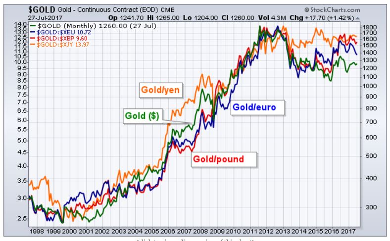 For a gold rally to be sustained, it has to do more than rally in dollar terms. It has to rally against foreign currencies as well. The last major rally in gold took place from 2002 to 2012. The first chart shows that gold rallied in dollar terms (green line), in euros (blue line), British pounds (red line), the yen (orange line) and the Canadian Dollar (not shown). That’s not the case right now.