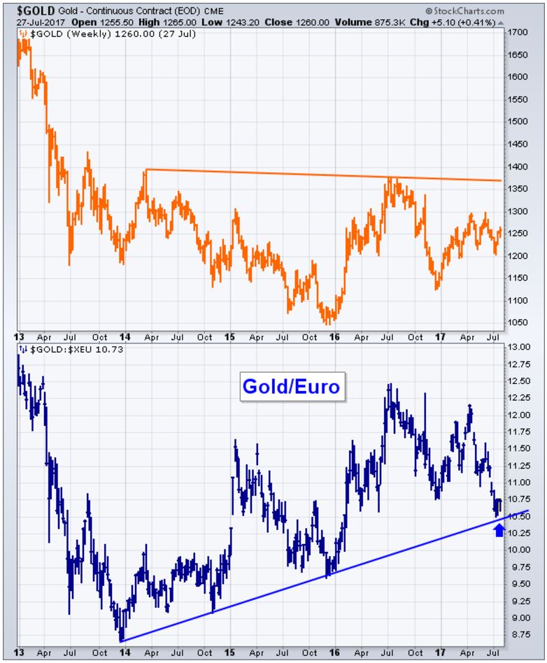 The third gold chart suggest that gold may be forming a major bottom. It still, however, has a long way to go to clear the trendline drawn over its 2014/2016 highs. Gold usually needs a more inflationary environment to thrive. It usually also does better when stocks are in decline which isn’t the case right now. [Next year, however, may be a different story]. But gold also has to start doing better versus the euro. The blue bars in the lower box show gold trading lower against the euro this year. Its proximity to the rising three-year trendline, however, suggest that gold may start finding support against that currency.