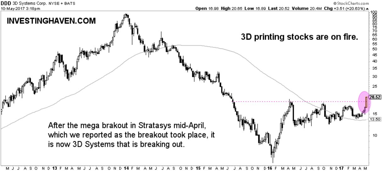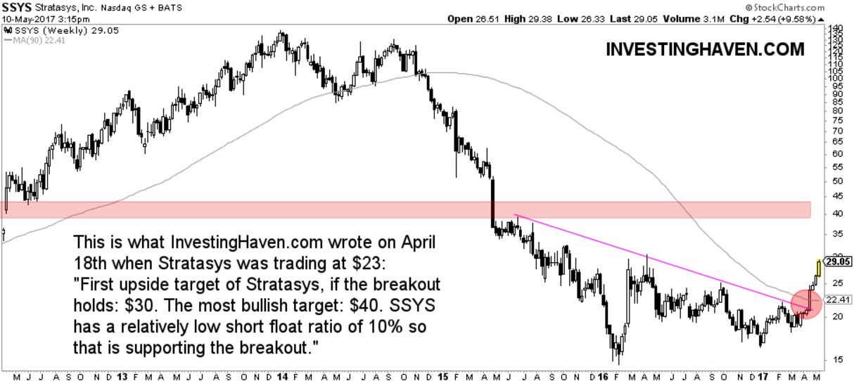 Mid-April 2017 was the moment we spotted a huge opportunity in 3D printing stock Stratasys (SSYS). The chart annotation seen below was published back then, when SSYS was trading 25 percent lower than it is today. Read how we spotted a breakout in 3D printing stock in April 2017 in SSYS.