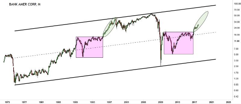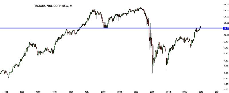 The monthly chart of Regions Financial Corp looks almost identical in the big picture. The price broke up of 16.10, and looks poised to hit at least 21-22 before taking a breath. This is likely to be followed by a potentially optimistic target of ~38