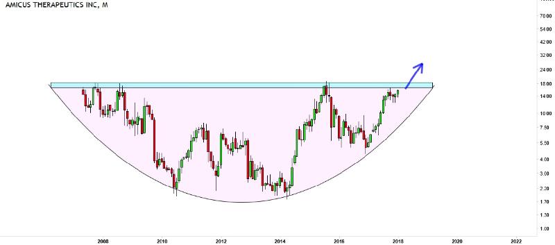 The stock price of Amicus has almost completed a cup and handle bottoming pattern. Immediate resistance of 17.8 had been tested thrice. The 11-year bottoming structure looks to provide the power for a 4th attempt to break this resistance. Should this level give away this time, our 2018 projection for FOLD is ~30. For the downside, if the resistance still remains strong and rejection happens, ~12.35 will provide important support. A failed attempt could bring the price to ~9.7