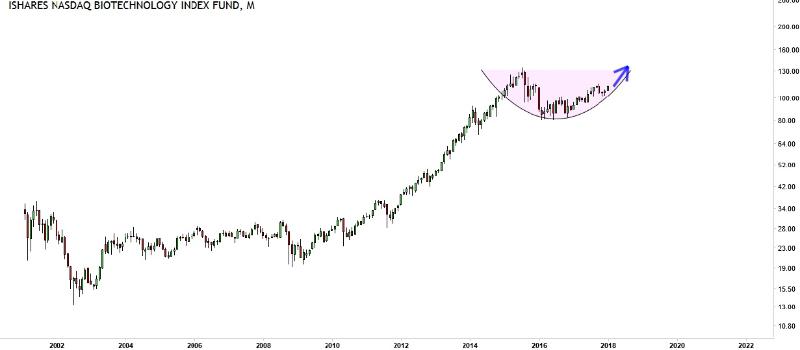 Although the monthly chart of IBB is far away from a convincing breakout there is a potential U consolidation pattern and could make the price drift higher that ultimately leads to a breakout. This is what InvestingHaven’s team is good at: lowest entry point with maximum upside benefit. Just in case price breaks down below the U pattern, the consolidation could take much longer.