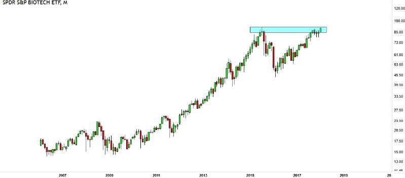 The SPDR S&P Biotech ETF (XBI) tracks an equal-weighted index of US biotechnology stocks, focuses exclusively on American stocks, and primarily consists of mid cap and small cap securities. As can be seen from the monthly chart, price is in the process of breaking through the previous resistance. And this could lead to more upside of the constituent stocks.