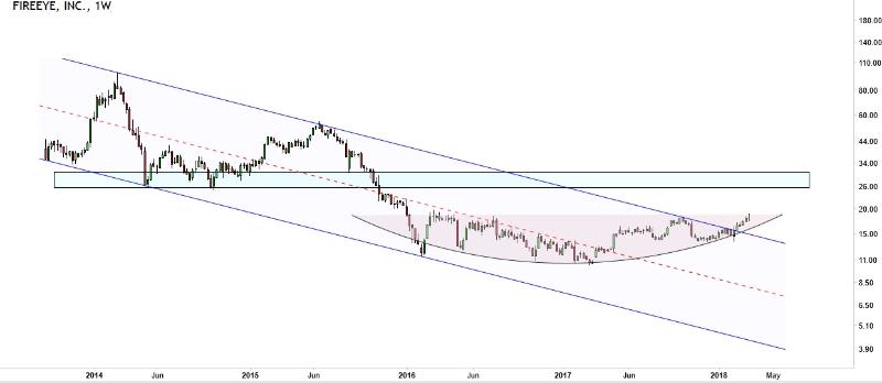 The weekly chart of FireEye has a persistent bearish structure along the downtrend channel since the top in March 2014. It is only in Jan 2016 that price engaged in a 2 year long rounding bottom consolidation that led to the break of downtrend channel. If price can break above ~19, the next higher target will be ~25 follow by ~32. However, if the break out attempt fails and price reverses, the next immediate target is ~16.2. Breaking below 13.5 will revert the positive outlook into negative one.