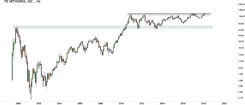 The chart of FFIV looks erratic though a closer look says it all. Price plunged from year 2000, and it had a tough 10 years of recovery before breaking above 75 in July 2010. From then on, another rectangular consolidation phase of 8 years and now look poised for yet another major break out above 150. Once this stock breaks out successfully, the next target will probably be ~200 follow by 300 in next 1-2 years. In case of heavy rejection price will fall into the consolidation zone again. Breaking below 70-75 zone will be bearish.