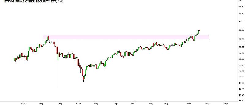 Since the inception of trading in Dec 2014, the world’s first cyber security ETF – HACK is designed to reflect the performance of companies involved in the cybersecurity industry, including companies that provide cybersecurity related hardware/software and services. The above weekly chart of HACK shows that price was basing for about 3 years before convincingly breaking above previous resistance. This more or less confirms the new stage of bull market in cybersecurity companies which visibly has started in 2018.