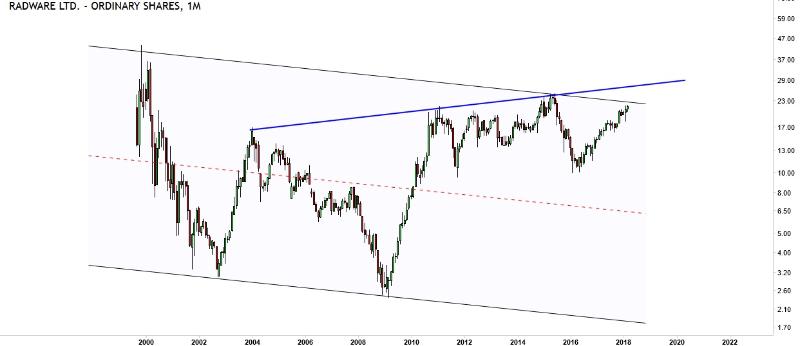 Price of Radware can be described as a mixture of ballistic and hard landing price movement since the collapse of dotcom bubble in the year 2000. Twice bottoming at 2002 and 2009 respectively. Entire price obeys the wide downtrend channel but things look to be about to change. With the strong fundamentals price can break out hard above the downtrend channel resistance. On the bullish side, we expect price to test 27.2 upon breaking above and subsequently consolidate and attempt to challenge 2000 resistance of 35.6 – 43.5. However, should this breakout attempt fail, and get rejected, it could spill into a potential right shoulder pattern with crucial support of ~18.5 followed by 13.8. Breaking below 10.3 confirmed the resumption of downtrend.