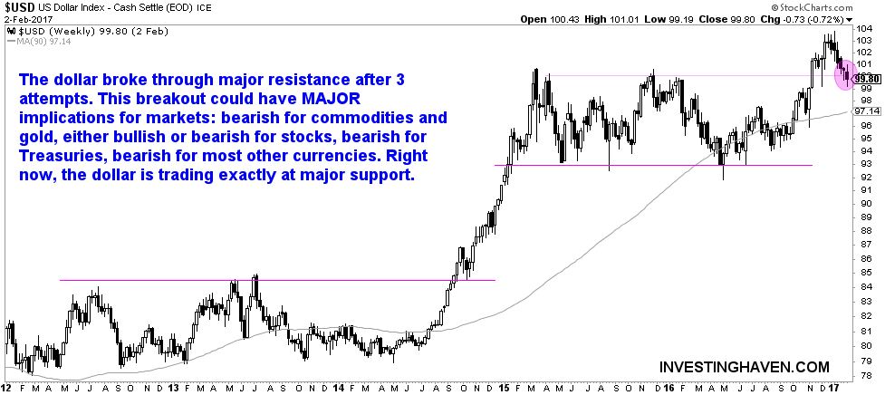 Second, the US dollar is testing its breakout point. The dollar broke through major resistance in November last year after 3 failed attempts in 2015/2016. This breakout could have MAJOR implications for markets: bearish for commodities, gold and currencies. Right now, the dollar is trading exactly at major support.