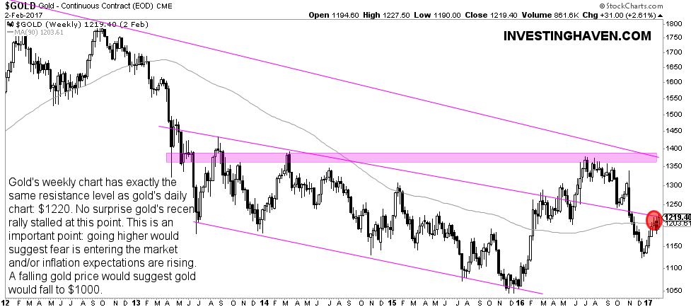 Last but not least, gold is trading at an important trend line. InvestingHaven’s point of view is that gold will only enter a bull market once above $1350. A move above $1220 would suggest a tactical bull market, not yet a structural bull market. If $1220 does not hold, gold will be eyeing $1000.